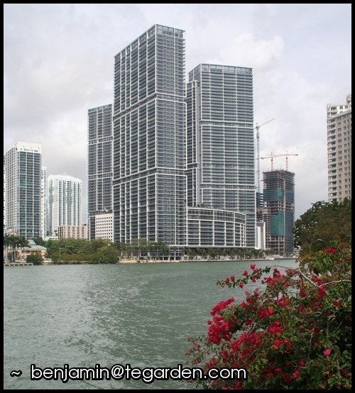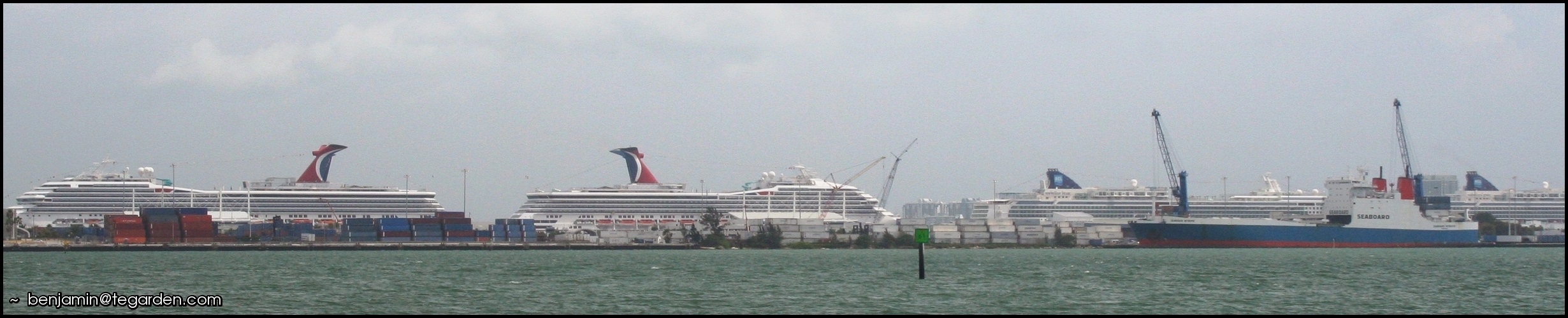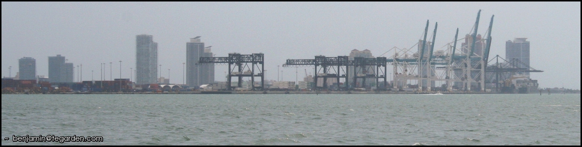 A panoramic view of Downtown Miami’s waterfrontOne of Miami’s many high-rise condosThis reminds me of an architectural renderingA waterfront developmentNothing gets in the way of the MetrorailCruise ships and cargo at the Port of MiamiContainer-handling equipmentThe gentle blues of the Florida KeysA beachfront pathOcean signposts